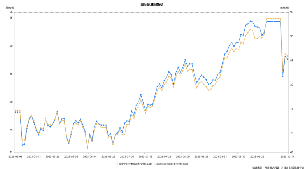 原油价格大幅震荡。截至9月29日,南华期货工业品指数、大宗商品价格总指数分别较9月22日当周下降1.9%、0.1%,除能源类大宗商品价格指数小幅上升,钢铁类、矿产类及有色金属类大宗商品价格指数均有不同程度的回落,其中钢铁类降幅相对明显;有色金属方面,铜铝价格双双回落,10月10日,LME铜和铝现货结算价分别较10月4日下降0.7%和2.6%至7907.5美元/吨、2199.0美元/吨。此外,假期期间国际原油价格持续下行,10月11日,Brent和WTI原油现货价分别较节前水平下降5.2%和4.9%至87.65美元/桶、85.97美元/桶,均低于去年同期水平,叠加近期巴以冲突等国际事件影响,原油价格整体波幅放大。