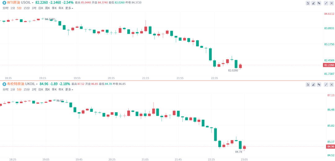 周三,尽管俄罗斯总统普京暗示很有可能会继续延长欧佩克+的减产协议,但由于以色列和哈马斯的冲突对石油流量的影响仍然有限,油价有所回落。WTI原油失守85美元/桶的水平,日内跌超2%,并在美盘时段跌至82美元附近。布伦特原油一度跌破85美元。