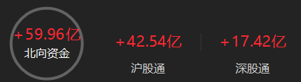 北向资金半日净买入59.96亿元,其中沪股通净买入42.54亿元,深股通净买入17.42亿元。