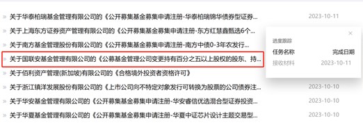 国联安基金上报关于股权变更的申请资料 来源:证监会官网