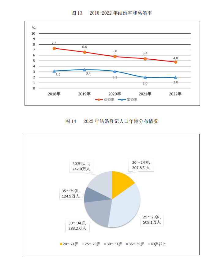 统计公报显示,2022年,全国婚姻登记机构和场所共计4310个,其中婚姻登记机构1103个,全年依法办理结婚登记683.5万对,比上年下降10.6%。结婚率为4.8‰,比上年下降0.6 个千分点。依法办理离婚手续287.9万对,比上年增长1.4%,其中:民政部门登记离婚210.0万对,法院判决、调解离婚77.9万对。离婚率为 2.0‰。