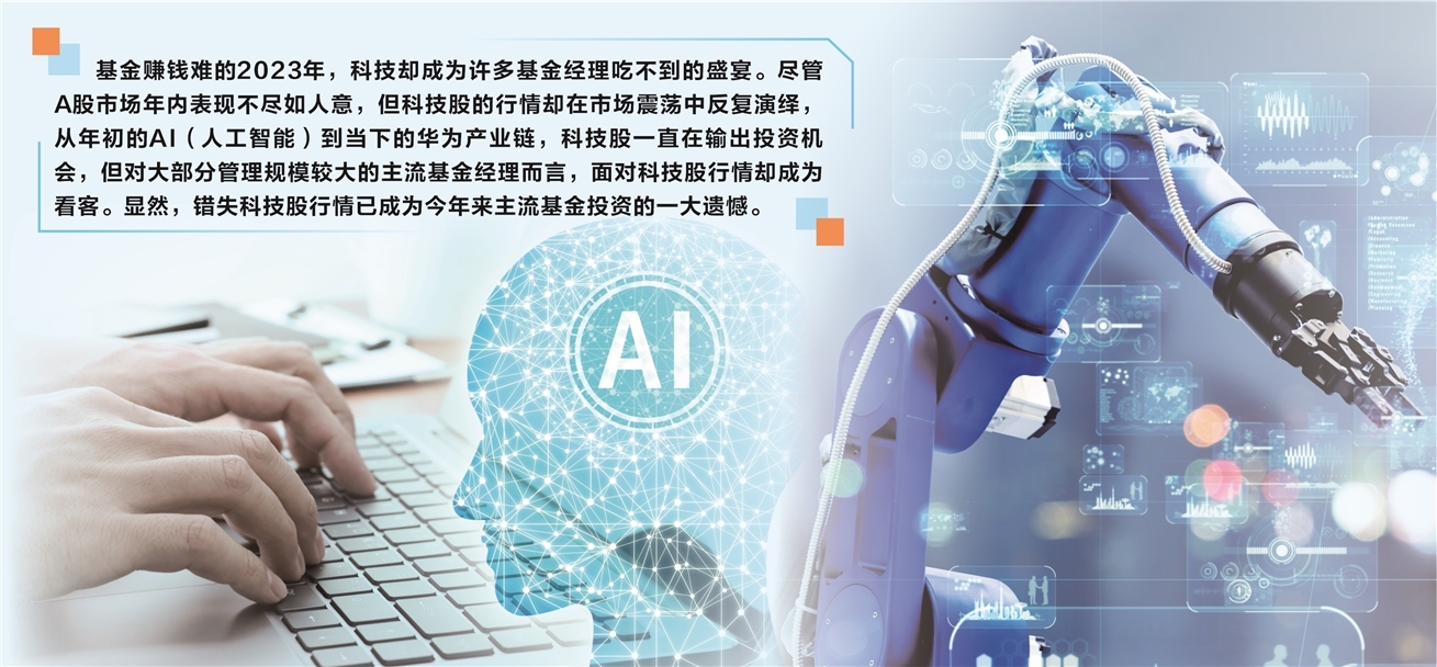 基金赚钱难的2023年,科技却成为许多基金经理吃不到的盛宴。尽管A股市场年内表现不尽如人意,但科技股的行情却在市场震荡中反复演绎,从年初的AI(人工智能)到当下的华为产业链,科技股一直在输出投资机会,但对大部分管理规模较大的主流基金经理而言,面对科技股行情却成为看客。