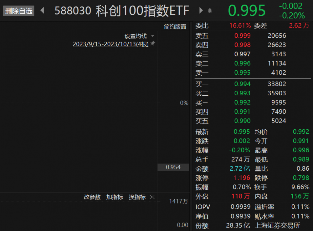 规模最大的跟踪科创100的ETF——科创100指数ETF(588030)10月13日收跌0.20%,溢折率0.11%,最新规模28.18亿元,周成交额超14亿元,连续6个交易日“吸金”4.45亿元,其中上周“吸金”近2.5亿元。
