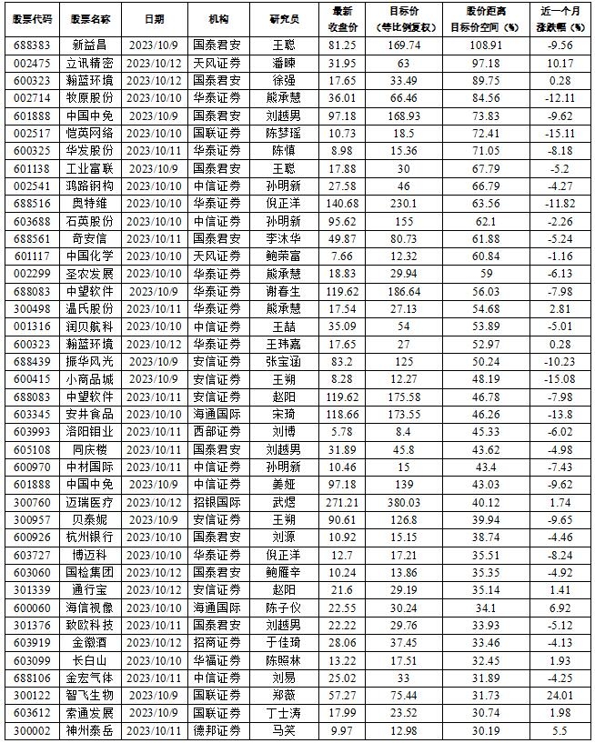 距周五收盘价向上空间最大的是新益昌(688383)。国泰君安研究员王聪在10月9日发表题为《新益昌:景气度下滑业绩承压,封装设备受益Chiplet发展有望加速成长》的研报中指出,景气度下滑及传统LED格局恶化,Q2业绩承压。考虑到兆驰COB封装线扩产以及Chiplet产线的加速布局,公司的Mini LED和封装设备有望加速成长,维持目标价为169.74元。按公司周五收盘价81.25元计算,股价还将有108.91%的空间。