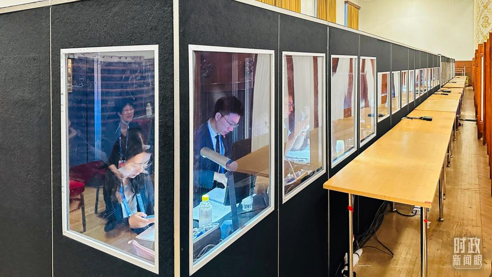 △开幕式现场的多语种同传间。(总台国广记者时冉拍摄)