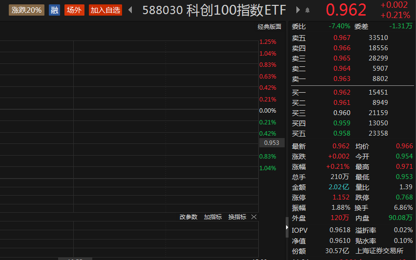 规模最大的跟踪科创100指数的ETF──科创100指数ETF(588030)逆市上涨,截至午间收盘涨0.21%,持续溢价交易,成交额2.02亿元,换手率6.86%。