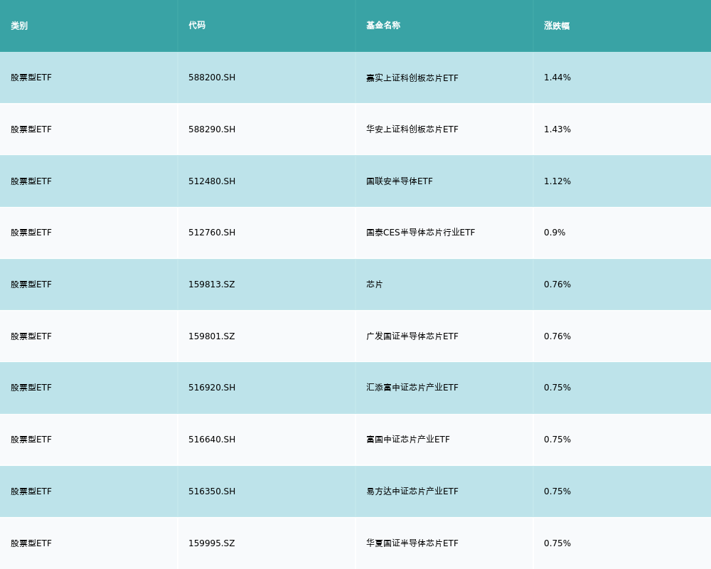 10月19日,股票型ETF涨幅最高的3支ETF及其收益率分别为:嘉实上证科创板芯片ETF(1.44%)、华安上证科创板芯片ETF(1.43%)、国联安半导体ETF(1.12%)。涨幅前10详情见下表: