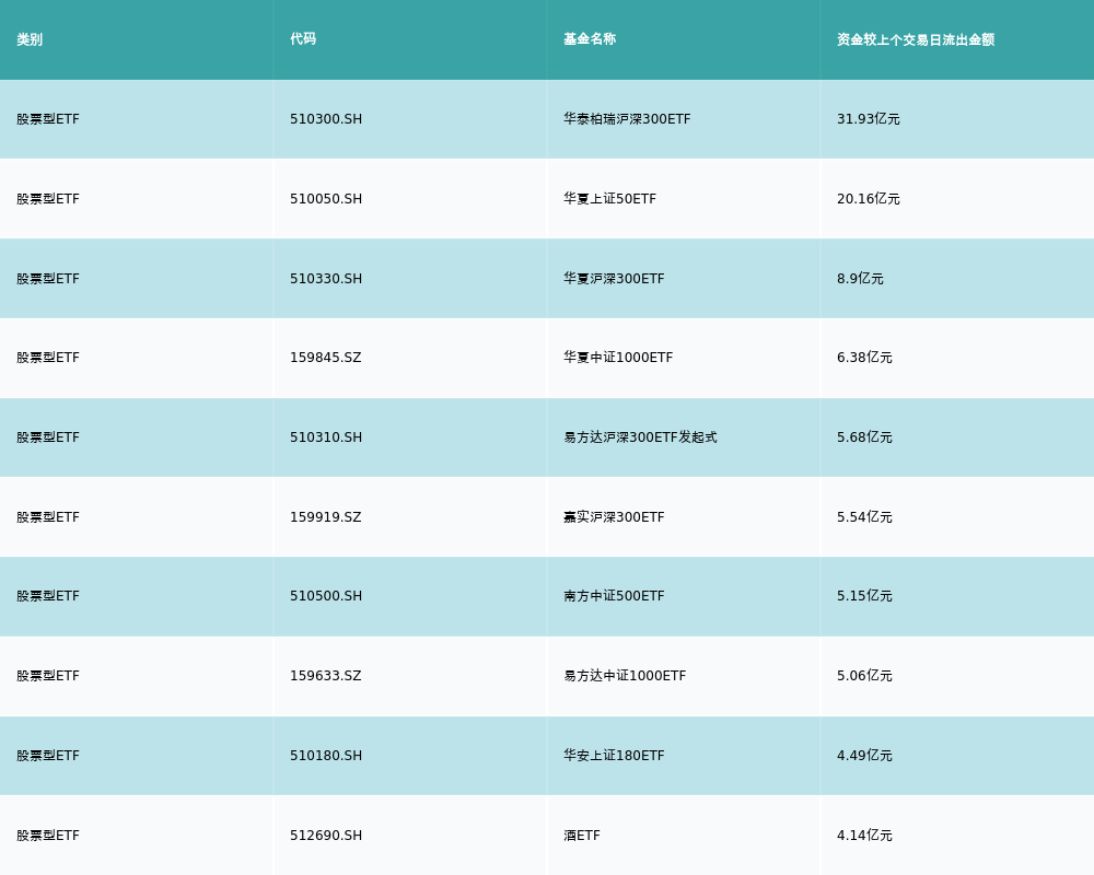 10月19日,股票型ETF资金流出最多的3支ETF及其流入金额分别为:华泰柏瑞沪深300ETF(流出31.93亿元)、华夏上证50ETF(流出20.16亿元)、华夏沪深300ETF(流出8.9亿元)。资金流出前10详情见下表: