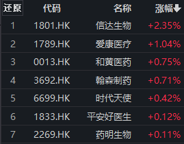 港股医疗保健板块早盘再度走低。相关指数中,中证港股通医药卫生综合指数 (930965) 一度跌超1%,成分股亦跌多涨少。截至发稿,信达生物涨超2%,爱康医疗涨逾1%,和黄医药、翰森制药、时代天使、平安好医生、药明生物跟涨。