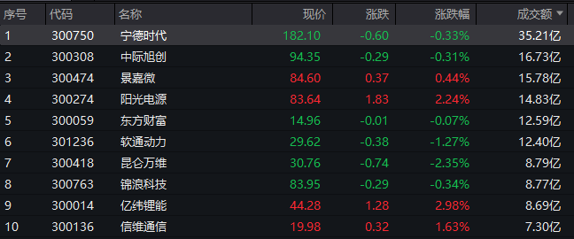 沪深两市半日成交额4695亿,较上个交易日同期缩量311亿。个股方面,截至午间收盘,宁德时代成交额排名第一,达35.21亿元;中际旭创、景嘉微、阳光电源、东方财富成交额分别为16.73亿元、15.78亿元、14.83亿元、12.59亿元。