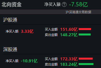 北向资金半日净卖出7.58亿元,其中沪股通净买入3.33亿元,深股通净卖出10.91亿元。