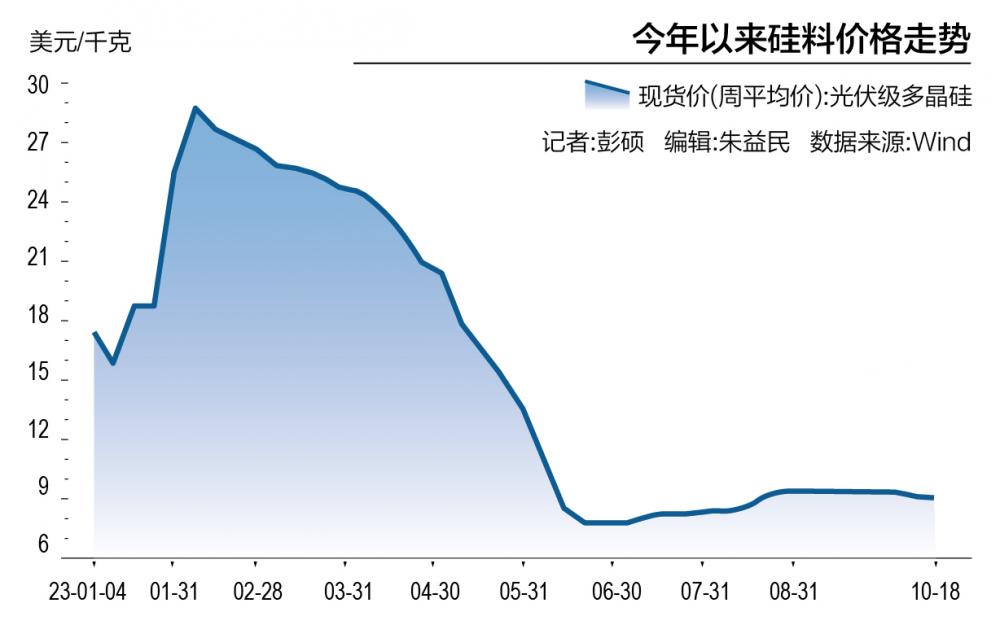 Wind数据显示:硅料价格在2023年1月末触及年内高点29美元/千克(约合212元人民币/千克)附近后,开始一路走低,直至2023年6月底来到最低点7.5美元/千克(约合55元人民币/千克)。到今年10月,光伏价格已回升到80元/千克附近。