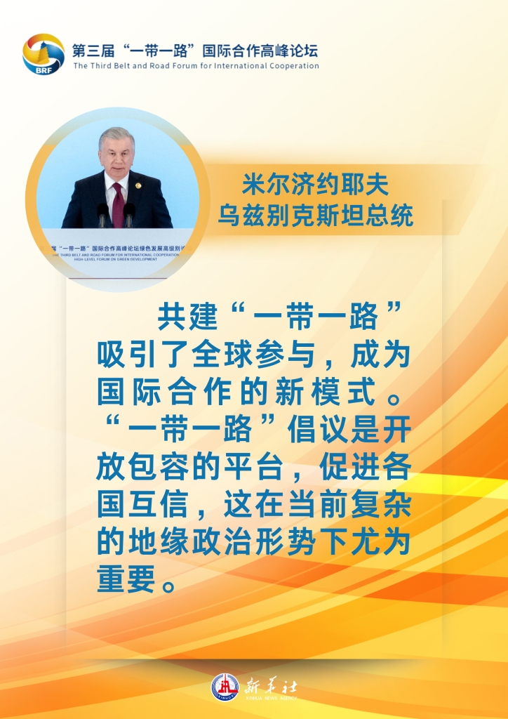 多位外国领导人和国际组织负责人18日在北京出席第三届“一带一路”国际合作高峰论坛时表示,高度认同习近平主席发表的主旨演讲,对习近平主席宣布的支持高质量共建“一带一路”八项行动感到非常鼓舞。他们认为,“一带一路”倡议有力促进各国共同发展,愿继续深化合作,推动共建“一带一路”取得更高质量、更高水平的新发展,携手打造下一个“金色十年”。