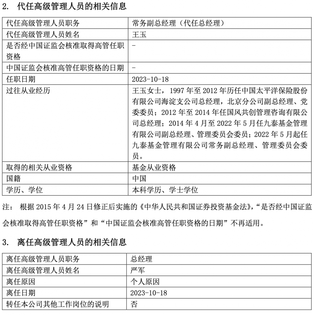 10月20日,九泰基金发布公告,总经理严军离任,由常务副总经理王玉代任总经理一职,任职日期是10月18日。