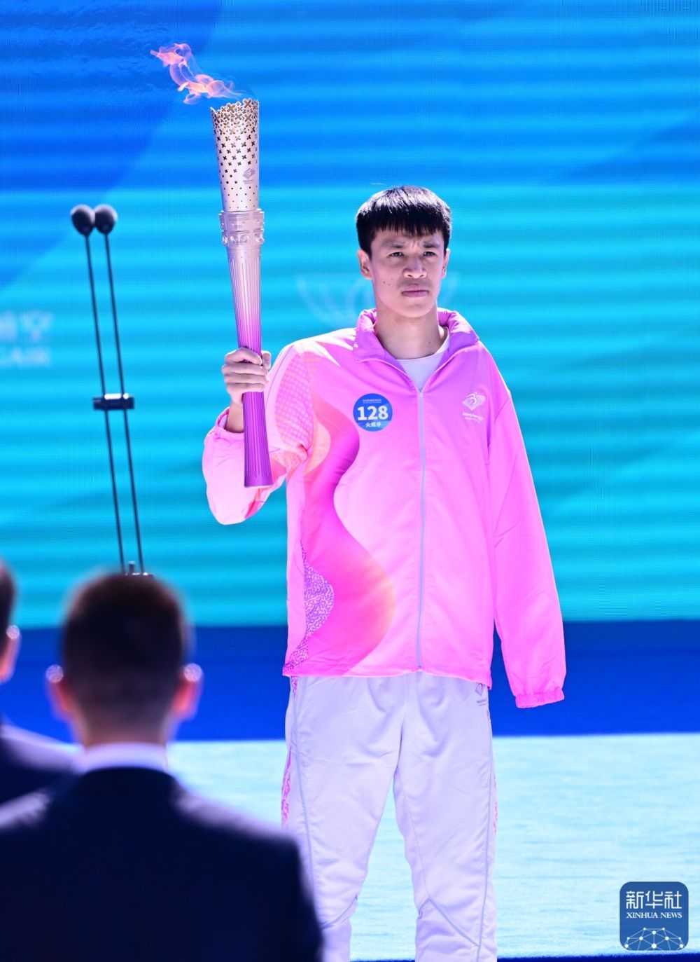 ↑最后一棒火炬手徐海蛟(左)点燃火种盆。