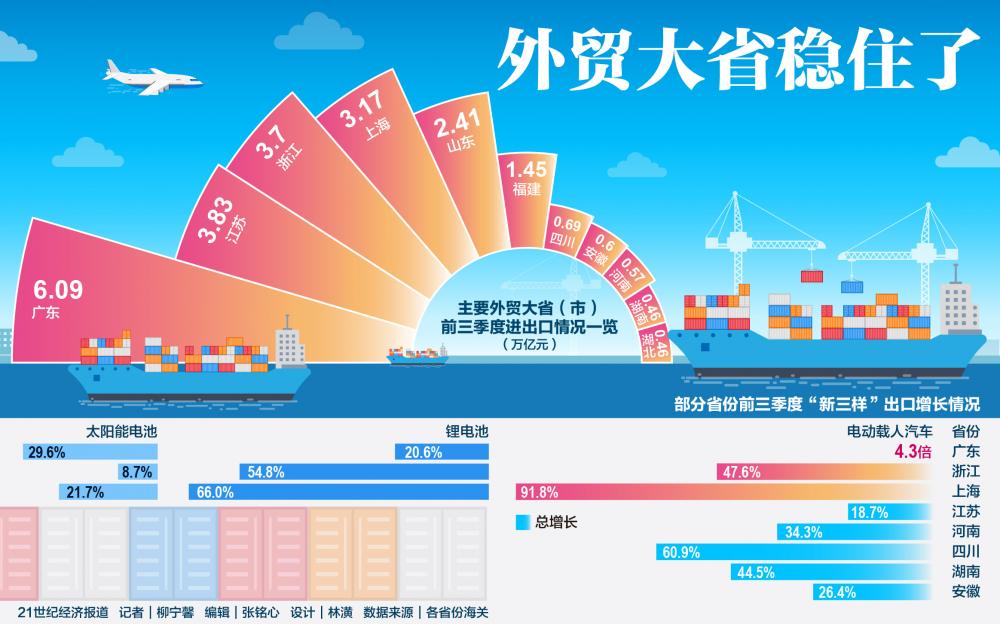今年前三季度,主要外贸大省稳住了进出口规模,但在全球外贸承压的背景下增速有限,体现出外贸恢复性增长过程不易。