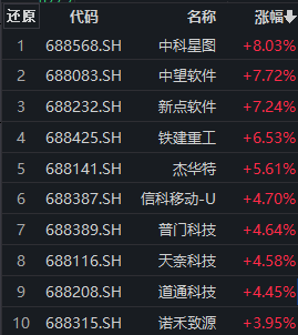 科创板个股早盘多数走强。相关指数方面,科创100指数(000698)高开高走,成分股多数上涨。截至发稿,中科星图涨超8%,中望软件、新点软件涨逾7%,铁建重工、杰华特、信科移动-U、普门科技、天奈科技、道通科技、诺禾致源等跟涨。