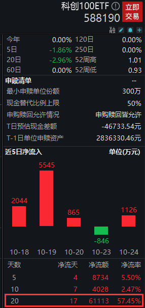 从资金流向来看,科创100ETF(588190)近20个交易日中有17日获资金净流入,累计净流入额超6亿元。