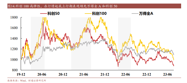 财通证券此前回顾科创100指数行情历史,2020Q2、2021H1、2022Q2这三段时间表现领先全A和科创50指数。这三段时间均为市场特别是科创板行情回升期,市场上行且科创50/100指数表现均领先全A。科创100指数在这三段科创行情上行期表现均强于科创50指数,反映科创100指数弹性更高。