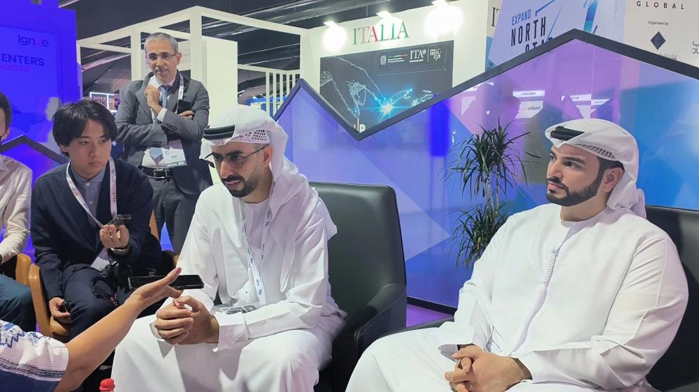 奥马尔·本·苏丹·奥拉玛(右二),在GITEX2023活动现场接受媒体采访。南方财经全媒体记者吴治聪 摄