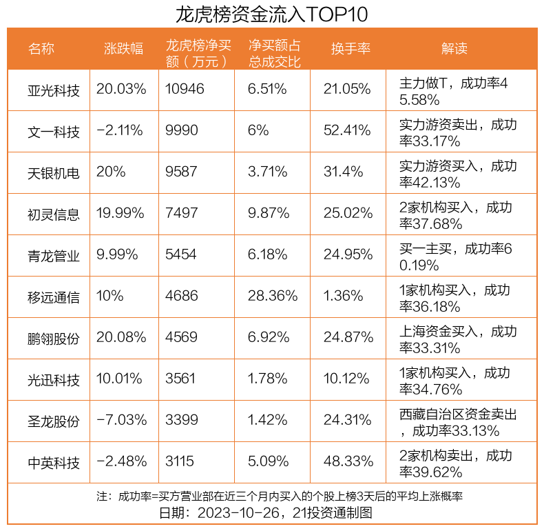 10月26日,上证指数上涨0.48%,深证成指上涨0.4%,创业板指上涨0.65%。盘后龙虎榜数据显示,共有43只个股因当日异动登上龙虎榜,资金净流入最多的是亚光科技(300123.SZ),达1.09亿元。