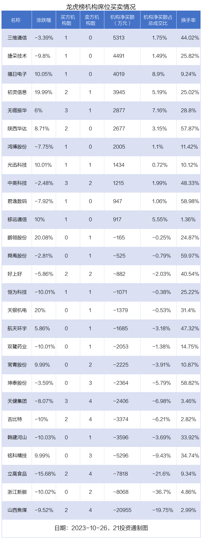 其中,机构净买入金额最多的是三维通信(002115.SZ),当日收盘下跌3.39%,换手率为44.02%。