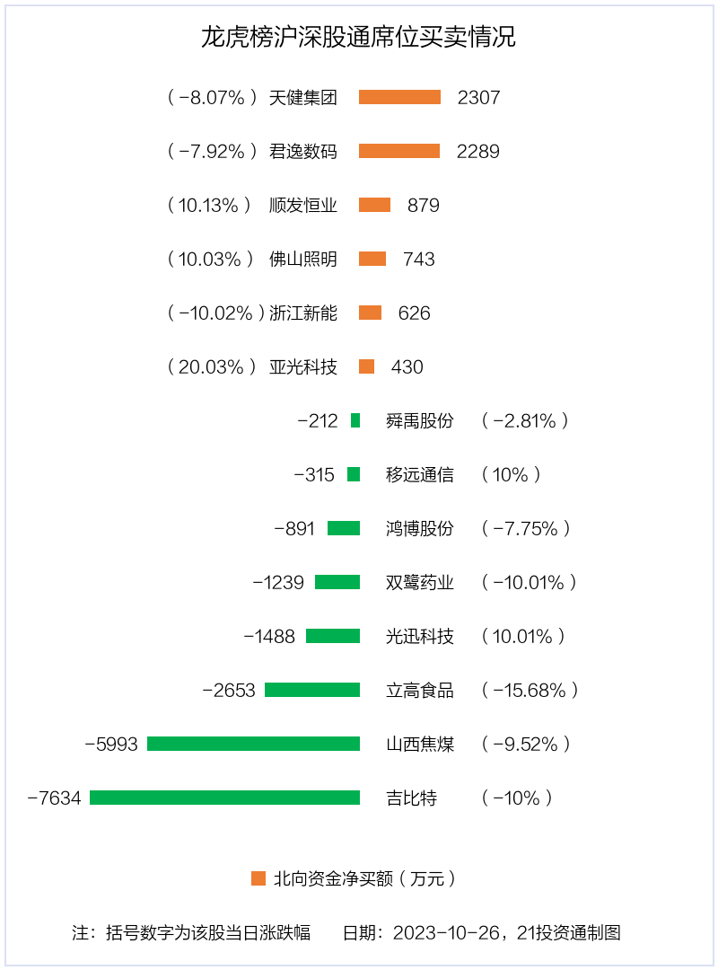 10月26日,北向资金参与龙虎榜中的个股共有14只,合计净卖出1.31亿元。其中沪股通净买入1 股,净卖出2 股,合计净卖出7322.23万元;深股通净买入5 股,净卖出6 股,合计净卖出5827.49万元。