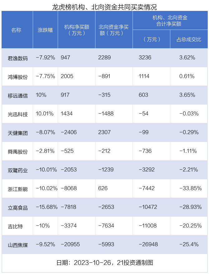 10月26日,27只个股龙虎榜出现了机构的身影,机构合计净卖出3.4亿元。具体来看,机构净买入11股,净卖出16股。