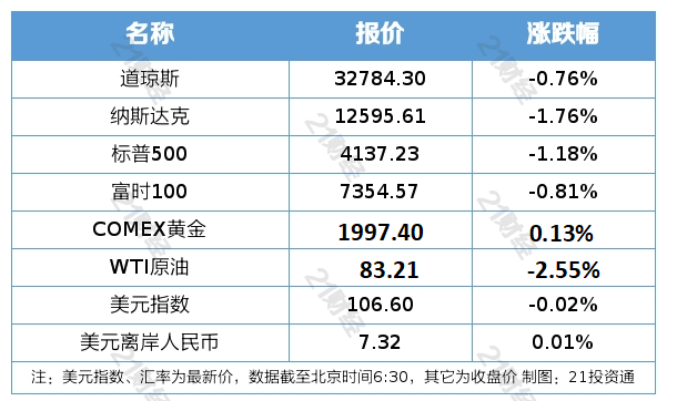 1、美股三大指数集体收跌,道指跌0.76%,纳指跌1.76%,标普500指数跌1.18%,大型科技股普跌,英伟达、微软、Meta、特斯拉跌超3%,苹果、谷歌跌超2%。电脑硬件、数据计算板块跌幅居前,西部数据跌超9%,超微电脑跌超5%,索尼、AMD、戴尔科技跌超2%。房地产、可再生能源、地区性银行股走高,伊格尔合众银行涨超13%,Sunrun涨超9%,美国电塔涨超8%,大众银行涨近8%。