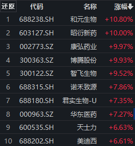 医药板块午后继续爆发。截至发稿,相关指数中,中证创新药产业指数(931152)大涨超5%,成分股几乎全部上涨。其中,昭衍新药午后封板,康弘药业此前涨停,和元生物涨超10%,博腾股份、智飞生物涨逾9%,诺禾致源、君实生物-U、华东医药、天士力、美迪西等跟涨。
