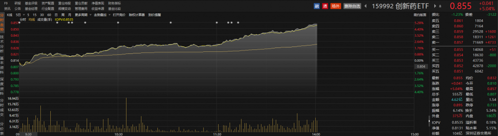 跟踪中证创新药产业指数的ETF中规模最大的创新药ETF(159992)午后继续拉升,交投持续活跃。截至发稿,该ETF上涨5.04%,溢折率为0.18%,成交金额达4.62亿元。