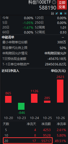值得注意的是,科创100ETF(588190)近20个交易日中有17日获资金净流入,区间累计净流入额近5.6亿元。