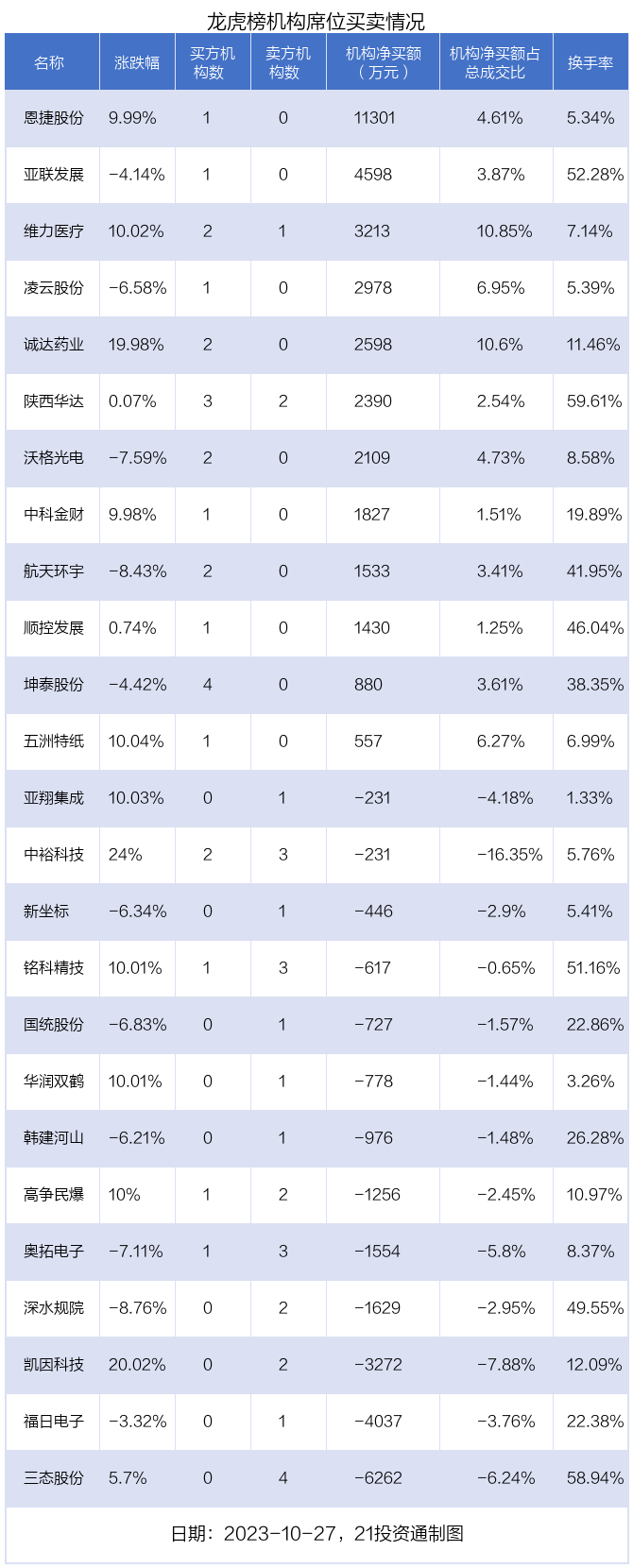 10月27日,25只个股龙虎榜出现了机构的身影,机构合计净买入1.34亿元。具体来看,机构净买入12股,净卖出13股。