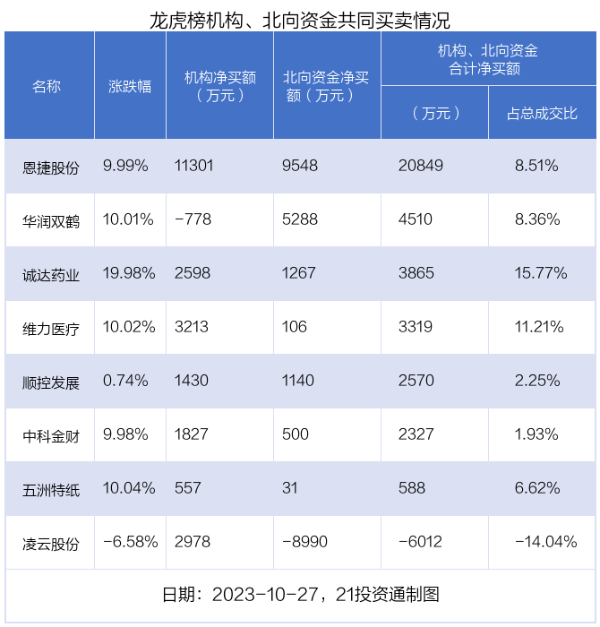 值得注意的是,机构和北向资金共同净买入了恩捷股份、诚达药业、顺控发展、中科金财、维力医疗、五洲特纸等6股;在华润双鹤,凌云股份上出现分歧,机构净卖出华润双鹤778.16万元,北向资金净买入5287.93万元;机构净买入凌云股份2978.18万元,北向资金净卖出8990.39万元。
