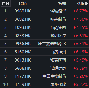 港股医疗保健板块早盘大幅走强。截至发稿,相关指数中,中证港股通医药卫生综合指数 (930965)上涨近4%,成分股多数走高。上涨个股中,诺诚健华大涨近9%,翰森制药、石药集团涨超7%,微创医疗、康宁杰瑞制药-B、百济神州涨超6%,和黄医药、诺辉健康、中国生物制药、康龙化成涨逾5%。