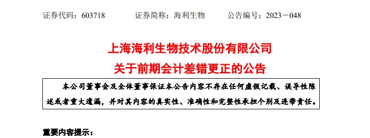 公司10月27日下午披露,公司发现前期披露的定期报告存在部分会计差错,现根据有关规定,对公司2023年半年度报告及以前部分年度中的相关财务信息进行更正。证券时报·e公司记者注意到,更正后,海利生物上半年的净利润超8000万元,同比增幅进一步提升。