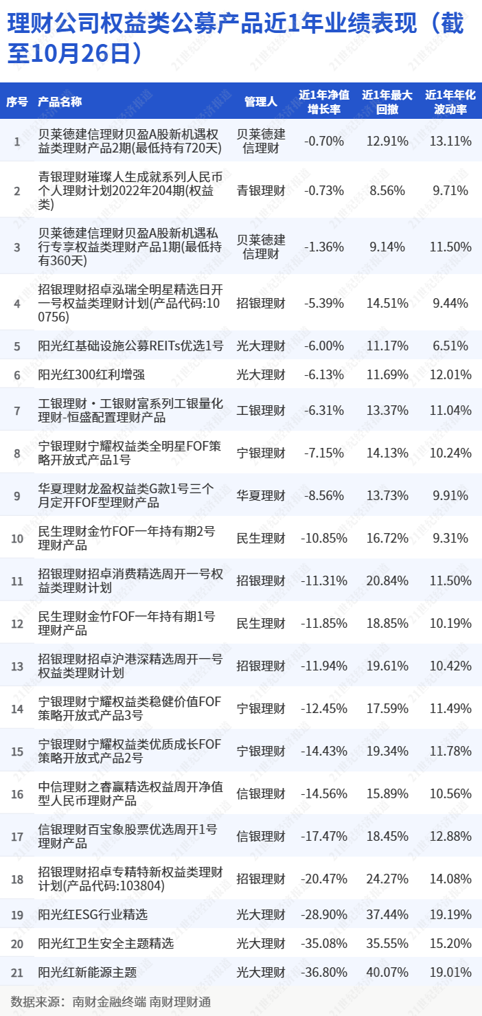 从近1年收益情况看,21只权益类公募理财产品近1年平均净值增长率为-12.78%,近1年最大回撤和年化波动率分别为18.75%和11.86%。其中,贝莱德建信理财“贝盈A股新机遇权益类2期(最低持有720天)”排名首位,近1年净值增长率为-0.70%。