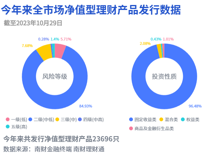 据南财理财通最新数据,截至2023年10月29日,今年来,全市场新发净值型银行理财产品23,696只(含私募产品)。