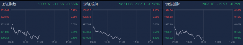 A股上午震荡走低,深证成指跌近1%,领跌三大指数。南财金融终端显示,截至上午收盘,上证指数跌0.38%,深证成指跌0.98%,创业板指跌0.79%。沪深两市个股跌多涨少,超3200只个股下跌。