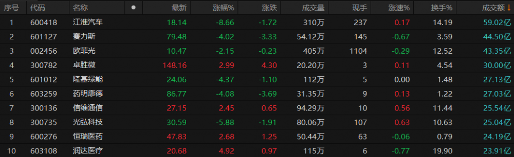 沪深两市半天成交额5989亿元,较上一交易日同期缩量555亿元。个股方面,截至午间收盘,江淮汽车成交额排名第一,达59.02亿元;赛力斯、欧菲光、卓胜微、隆基绿能成交额同样居前,分别为44.50亿元、43.35亿元、30.00亿元、27.13亿元。