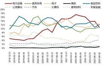 从主动权益基金的重仓股行业分布来看,食品饮料、医药、非银金融、建材等行业处在持仓相对低位,而电子、汽车、煤炭等处在持仓相对高位,电力设备的持仓量则已接近2021年3月新能源行情启动前的位置。