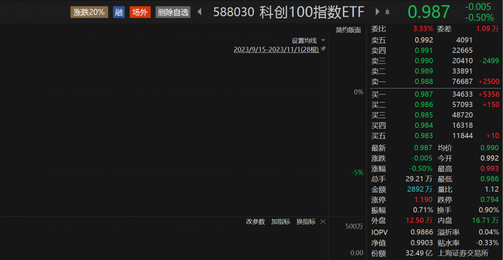 三大指数集体高开,沪指高开0.64%,深成指高开0.35%,创业板指高开0.04%。科创100(000689)低开震荡,跟踪该指数规模最大的科创100指数ETF(588030)开盘后低位震荡,现跌0.50%,盘中持续溢价,溢折率0.04%。