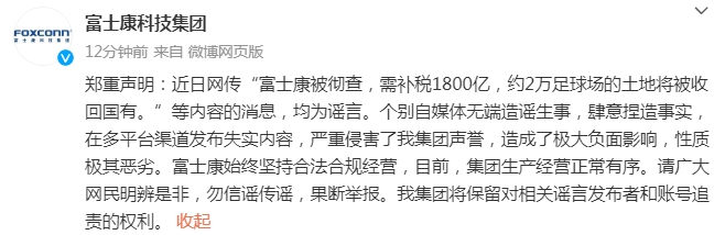 近日网传“富士康被彻查,需补税1800亿,约2万足球场的土地将被收回国有。”等内容的消息,均为谣言。个别自媒体无端造谣生事,肆意捏造事实,在多平台渠道发布失实内容,严重侵害了我集团声誉,造成了极大负面影响,性质极其恶劣。富士康始终坚持合法合规经营,目前,集团生产经营正常有序。请广大网民明辨是非,勿信谣传谣,果断举报。我集团将保留对相关谣言发布者和账号追责的权利。