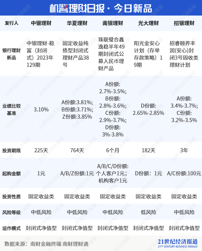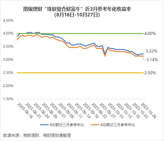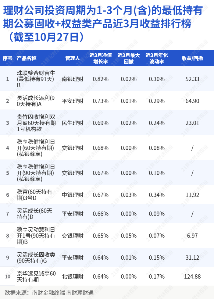 据了解,榜首产品南银理财“珠联璧合财富牛(最低持有91天)B”为中低风险的固定收益类产品,每个工作日(非节假日和调休工作日,下同)开放申购,持有满91天后每个工作日均可赎回,T+1个工作日即可确认。