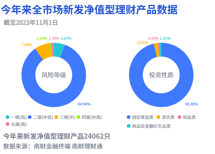 据南财理财通最新数据,截至2023年11月1日,今年以来全市场新发净值型银行理财产品24,062只(含私募产品)。