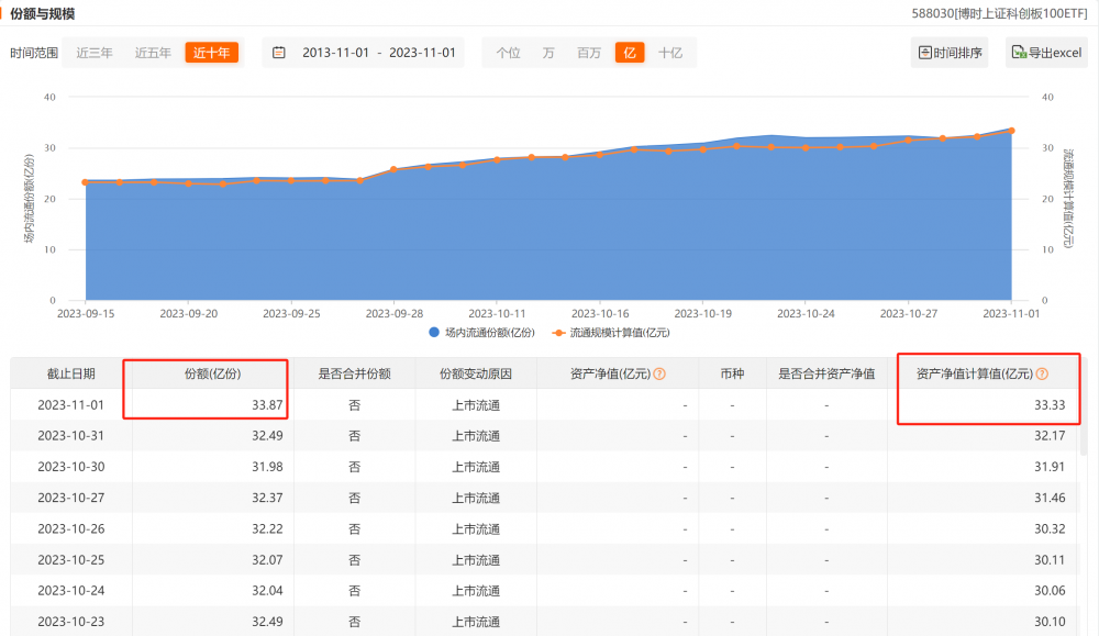 科创100指数ETF(588030)份额和规模进一步增长,双双创历史新高。截至11月1日,该ETF最新份额为33.87亿份,最新规模为33.33亿元。该ETF近20个交易日资金净流入9.49亿元。