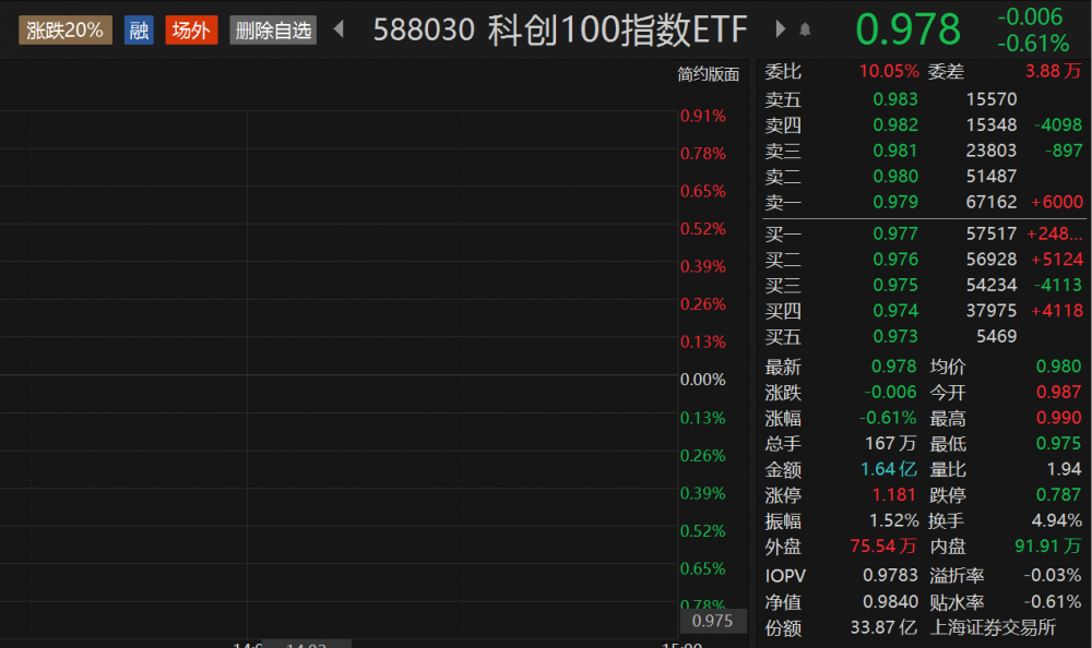 跟踪该指数规模最大的ETF——科创100指数ETF(588030)盘中跌幅小幅收窄,现跌0.61%,成交额1.64亿元。