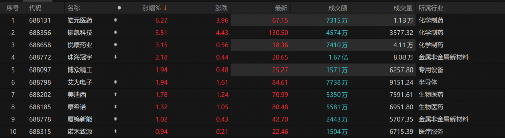 涨幅方面,皓元医药涨超6%,键凯科技、悦康药业涨超3%,珠海冠宇涨超2%,博众精工、艾为电子、美迪西、康希诺等跟涨。