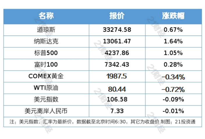 1、美股三大指数集体收涨。大型科技股走高,苹果涨1.87%,微软涨2.35%,亚马逊涨2.94%,英伟达涨3.79%,Meta涨3.51%。热门中概股涨跌不一,纳斯达克中国金龙指数收跌1.43%。