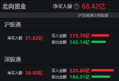 北向资金半日净买入68.42亿元,其中沪股通净买入31.62亿元,深股通净买入36.80亿元。